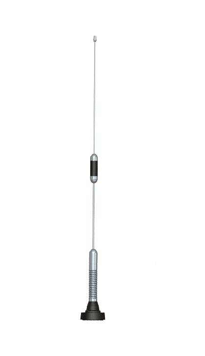 Possui fixação NMO (whip), permitindo instalação prática no teto de veículos ou superfícies metálicas com raio mínimo de 1/4 de onda mais 5% da frequência utilizada. A mola integrada à base amplia a resistência mecânica, ideal para uso contínuo e severo, com ótima relação custo-benefício.